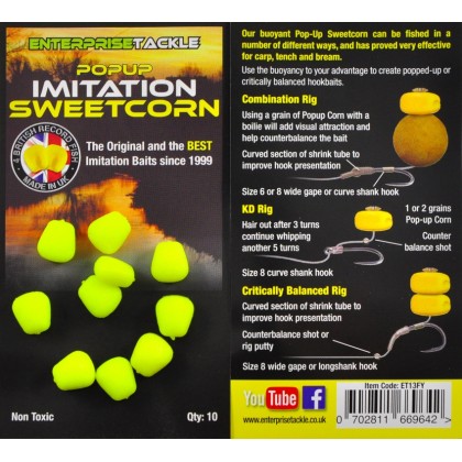 Enterprise Tackle PopUp Sweetcorn Fluoro Yellow поймала тысячи трофеев по всей Европе. Изготовленные из особого мягкого материала, зерна отлично впитывают ароматизатор и надежно держатся на волосе. Вы можете использовать их как одиночную насадку, так и как дополнение к бойлам, пеллетсу, зерновым, создавая нужную Вам презентацию.