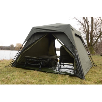 SP Bankmaster Quick-Up Shelter - универсальный шелтер, чрезвычайно быстрой сборки. Достаточно простороное укрытие, хоть и считается одноместным, но в нем спокойно можно поставить две раскладушки. Этот шелтер можно использовать и как кухню, и как палатку. Изготовлен из ткани SolarTex. Благодаря вентилируемым сеткам и накидке можно не боятся конденсатов - их не будет.